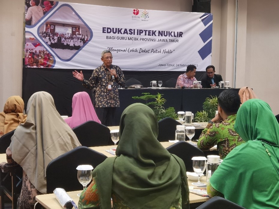 Sidoarjo – Humas BRIN. Politeknik Teknologi Nuklir Indonesia (Poltek Nuklir) BRIN menyelenggarakan Edukasi Iptek Nuklir bagi guru MGBK Provinsi Jawa Timur pada Jum’at (24/2). Menurut Direktur Poltek Nuklir Zainal Arief, pemanfaatan nuklir tidak hanya sebatas bidang energi saja. “Saat ini Indonesia memang belum memiliki PLTN, meskipun demikian sudah ada banyak pemanfaatan teknologi nuklir dalam bidang lain seperti industri, manufaktur, kesehatan, pangan, dan lainnya,” ungkapnya.